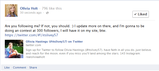 Olivia posted on facebook, "Are you following me? If not, you should. :) I update more on there, and I'm gonna to be doing an contest at 300 followers, I will have it on my site, btw." linking her twitter, @itslivey57.